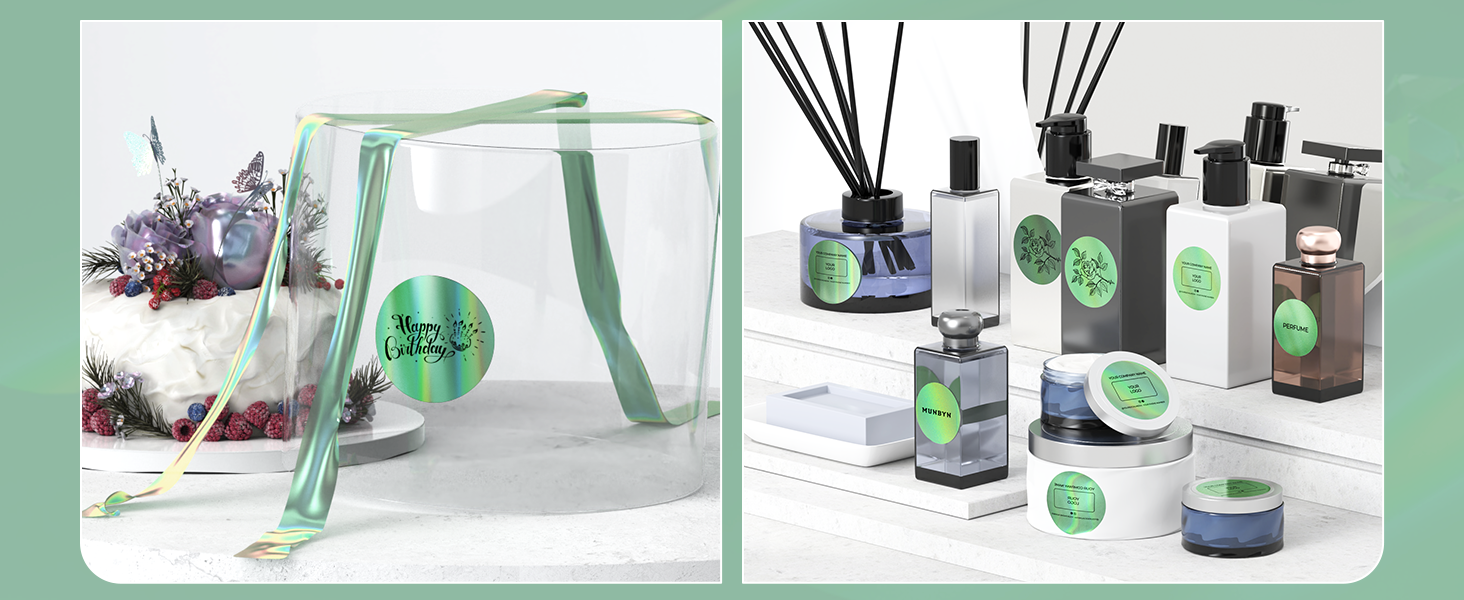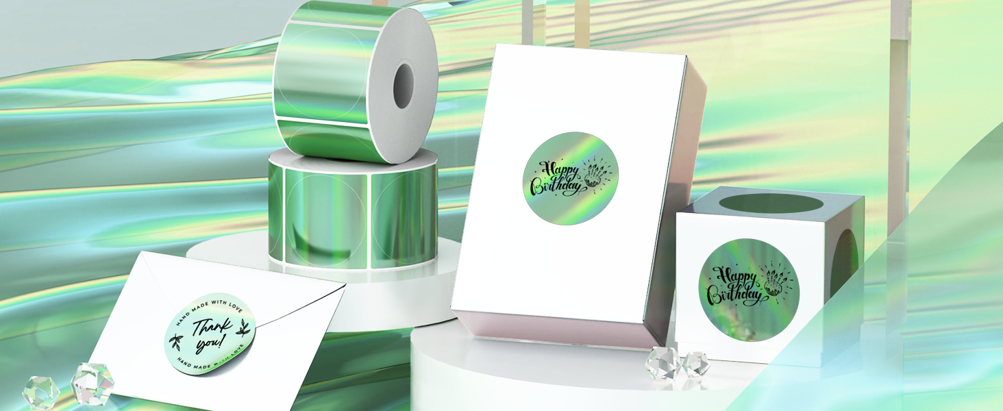 Logo stickers, thank-you labels, QR codes, product info labels.