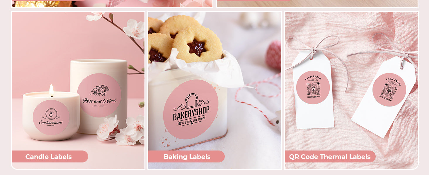 Logo stickers, thank-you labels, QR codes, product info labels.