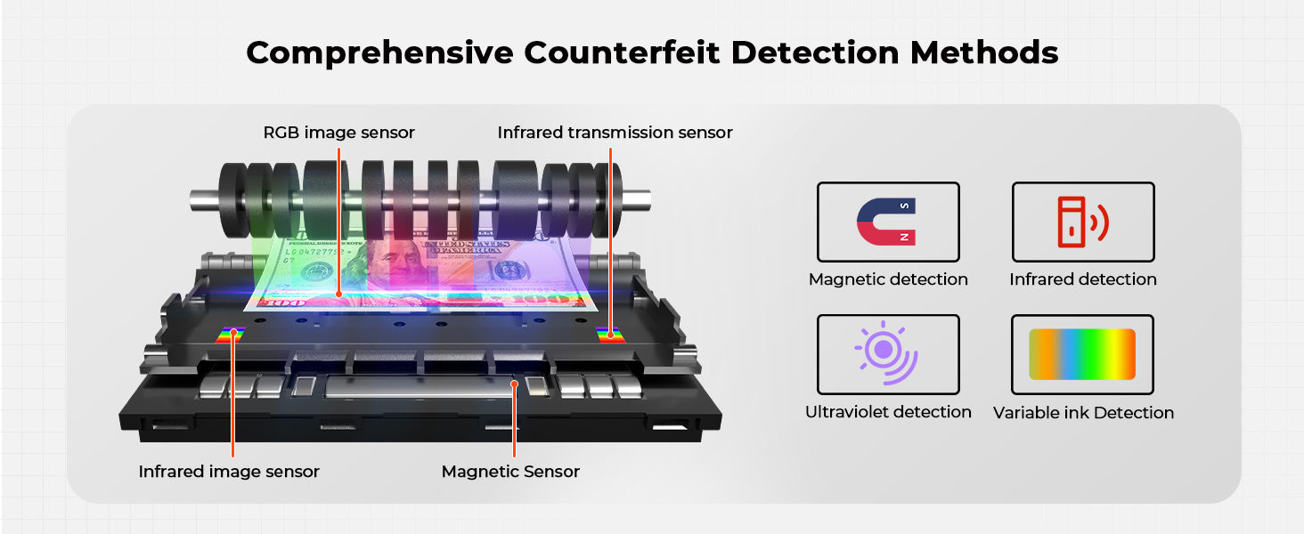 Counterfeit Detection | UV, IR, MG, MT, Dimensional, Thickness, Security Line, Variable Ink, Spectrum, Fluorescence (Bank-grade detection) |