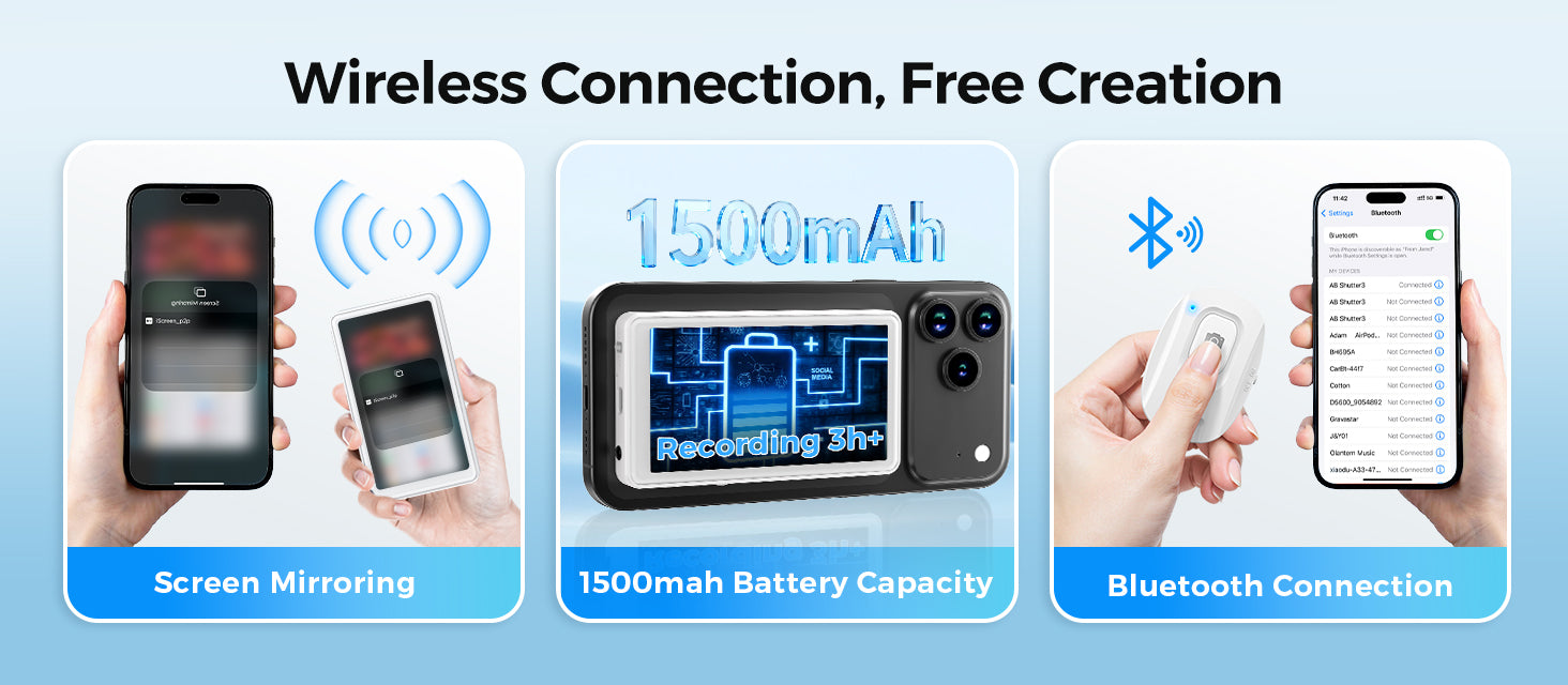 - 【33ft Bluetooth Remote Control】Equipped with a 33-foot (approximately 10-meter) ultra-long-range Bluetooth remote control, it allows for remote shooting and pausing, solving framing challenges for solo shooters. It's perfect for self-media creators or collaborative shoots, eliminating the need to repeatedly return to the camera position, allowing you to create professional-quality videos with minimal arm strain