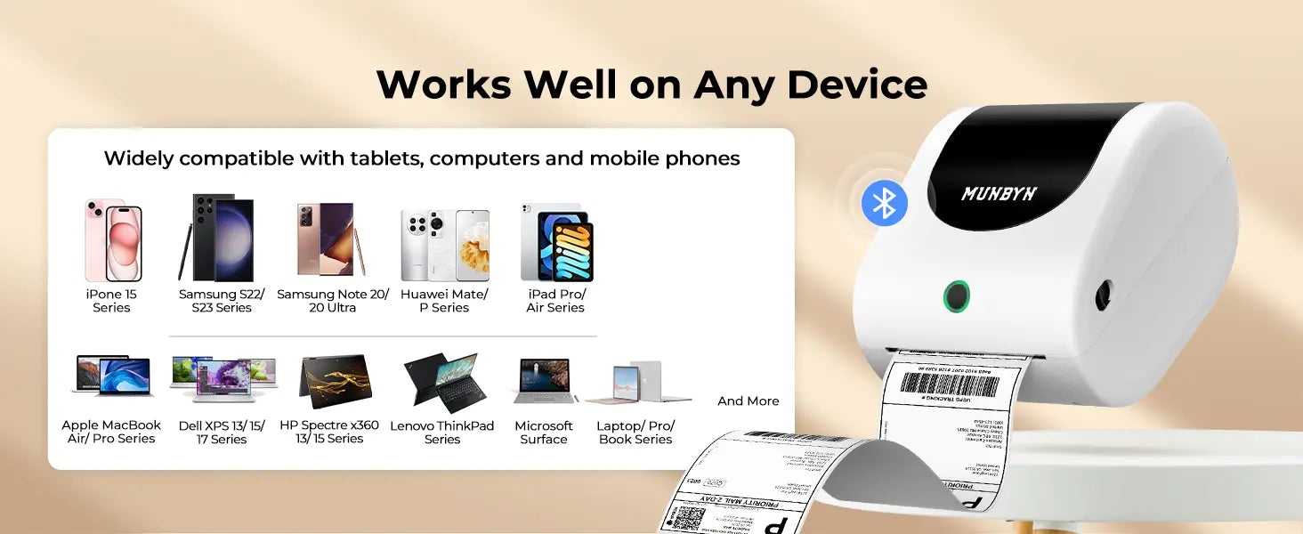 - Supports Mobile and PC: Bluetooth label printer can be connected to Windows and Mac computers via USB. It also supports Bluetooth connectivity with iOS, Android, and tablets. With Bluetooth, you can print labels anytime and anywhere without being restricted by location. Simply download the "MUNBYN Print" app for efficient and easy label printing.