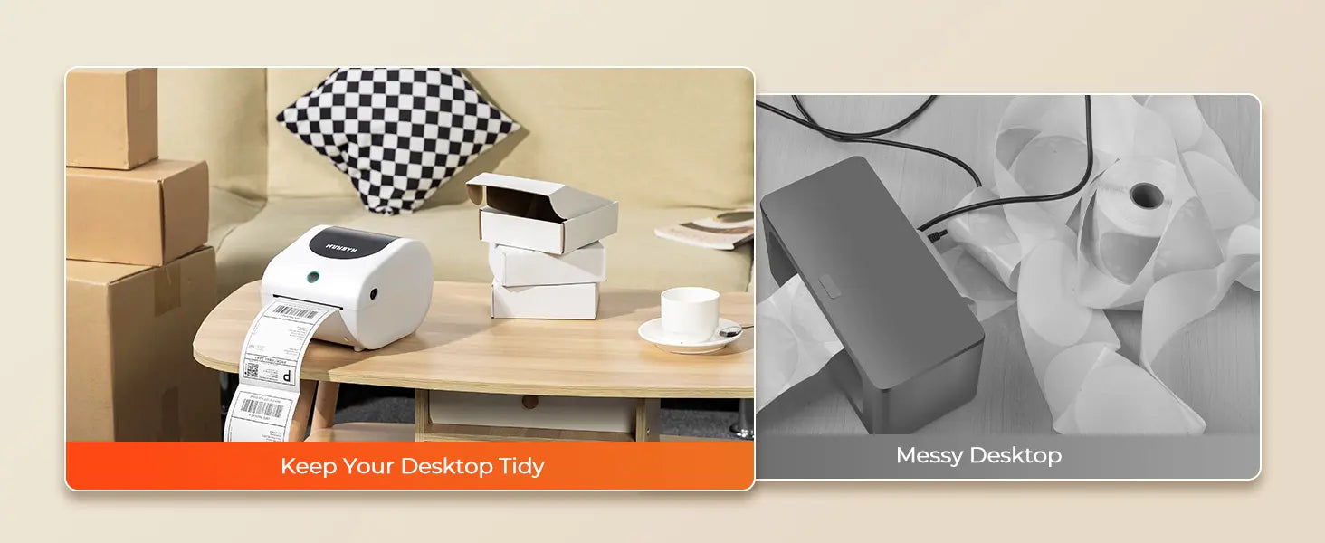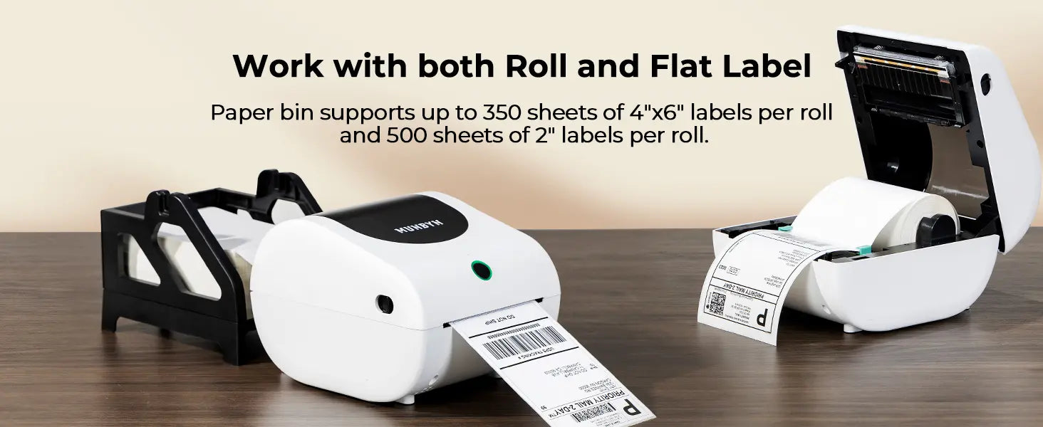 - High-Efficiency Compact: This Bluetooth thermal label printer features a large-capacity paper tray design. The revolutionary design supports both internal roll paper (up to 350 labels) and folded paper loading from the back without needing an extra holder. This flexibility saves desktop space and significantly enhances work efficiency, making every inch of space count.
